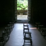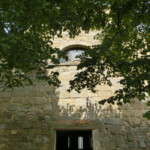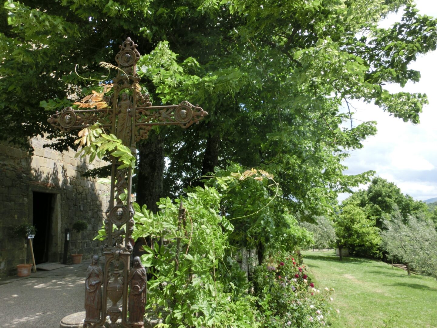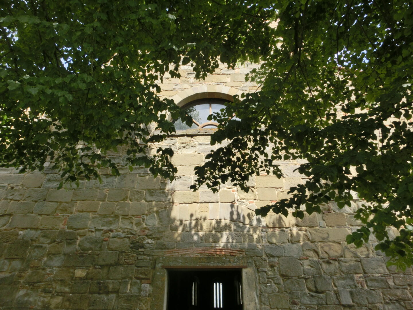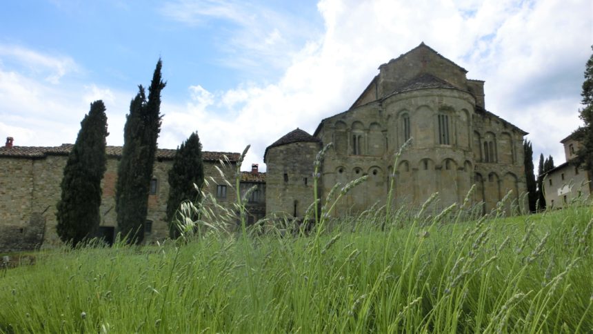 駐車場から来た道を戻ると、右側が教会、左側にはコミュニティの各施設、バールと飲食スペース、ブックショップなどが並んでいます。もちろん、まずは教会へ。この教会が建立される前、エトルリア時代、ローマ時代から教会が存在していたと言われていますが、現在の教会が建造されたのは1152年。ここよりも北にあるラ・ヴェルナ、カマルドリの修道院を訪れた巡礼者の休憩所として使われていたそう。その後、フィレンツェを追われて近郊のポッピに隠居中のダンテや、詩人のダヌンツィオなど、文化人も多く訪れています。