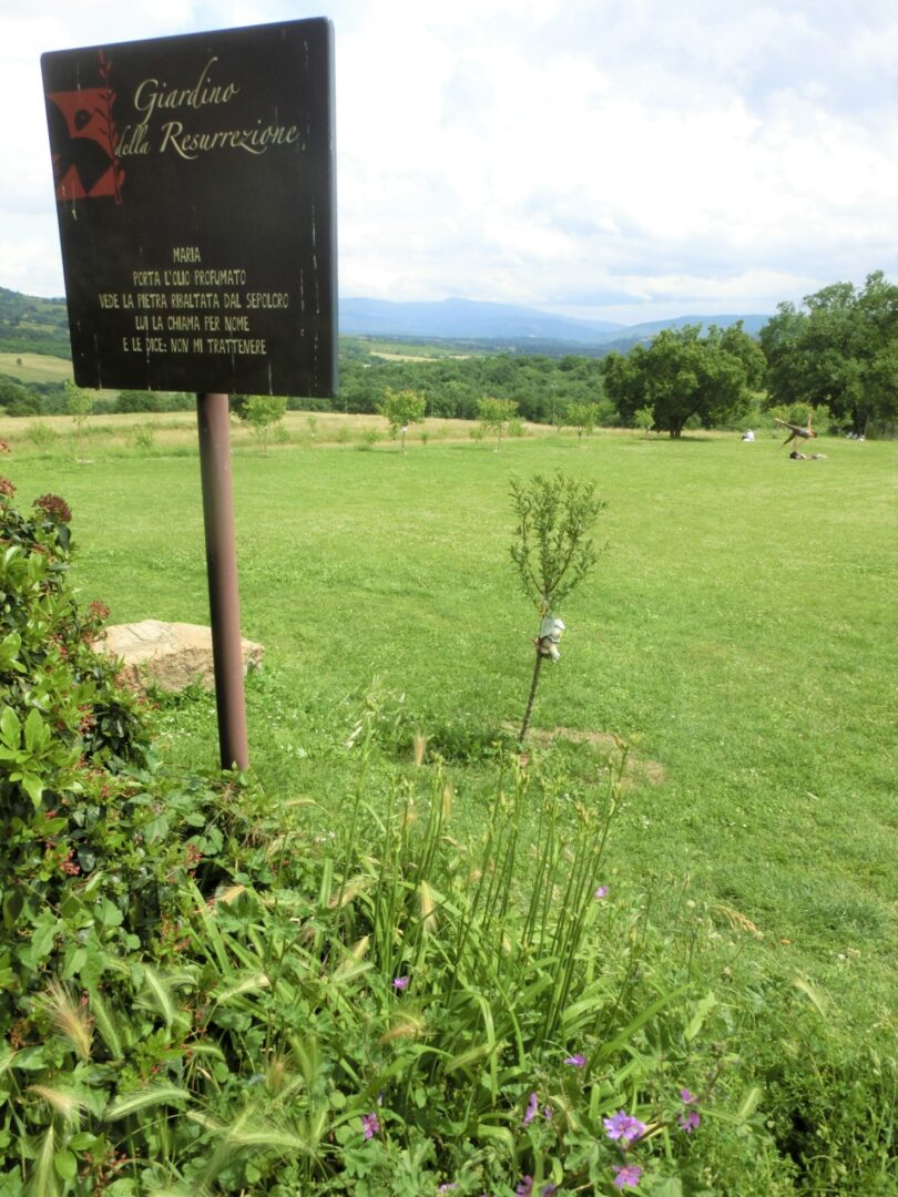 その後、バールの外で一休み・・・偶然ですが、ここにも鋳造アートを発見!隣の看板を見ると、「復活への道」として8つのアートを巡るようになっており、これは1つ目の「謙虚さ」。2つ目以降は信頼、自由、軽さ、許し、誠実さ、優しさ、そして’最後が「愛」=2つ上の写真の、草原にある作品。もう車に乗る前だったので今回は周りませんでしたが、次回は全てのアートを見て周りたいです。