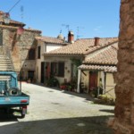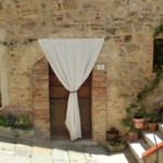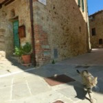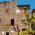 教会からもと来た道を戻り、更に先を左側に上っていくと、カスティリオーネの中心的な広場=イル・ヴェッキエッタ広場に着きます。イル・ヴェッキエッタはこの村出身のルネサンス期のシエナ派の画家、ロレンツォ・ディ・ピエトロのあだ名で、中心には丸い井戸が~なんと1618年のトラバーチン製のオリジナルです。そして時計のあるかつての市役所、レンガと石で幾何学模様になった地面が印象的な広場です。取り囲む石造りの民家もとっても可愛いですよ。