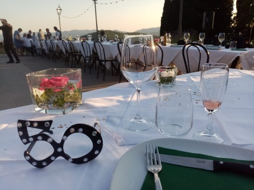 今回、ダンナ幼馴染の「50才=チンクアンタ」の誕生日パーティが盛大に行われていました。おらが村から南東に30分、フィレンツェからも北東に30分、という好立地にあるアグリツーリズモ。コロナの影響もある中、幹事がいろいろ探して見つけてくれ、オープンスペースで着席スタイルになりました。なんだか、映画の世界のようでしょう?