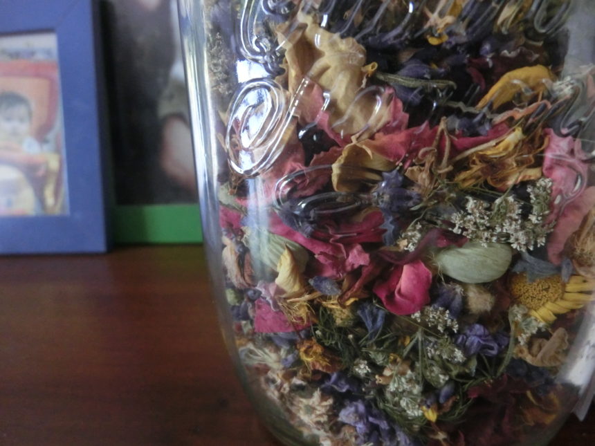 翌日にたっぷり水の恩恵を頂いた後、花を取りだして並べると、捨てるなんてできないくらい美しくって・・・そのままドライフラワーにして瓶詰めに。このまま飾るだけでもよかったのですが、せっかくなのでもっと大きな瓶にして、食器ボードにある本のブックエンドにしようと思いつきました。しかし、花が足りないな~ってことで、公園脇にて、マロウなどを採取。