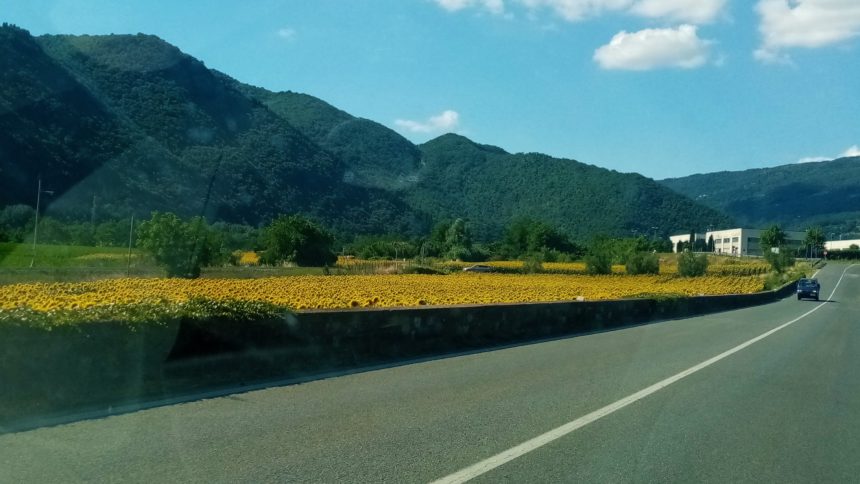 新緑と野の花の春、食祭りの秋が人気ですが、夏は夏ならではのトスカーナの風景があります。その代表的なものが、ひまわり畑。上記記事のモンタルチーノのひまわり畑のように希に8月に開花することもありますが、通常は7月。いつもは日本に行っていて見られないのですが、今年はあちらこちらで美しいひまわり畑に遭遇しています。
