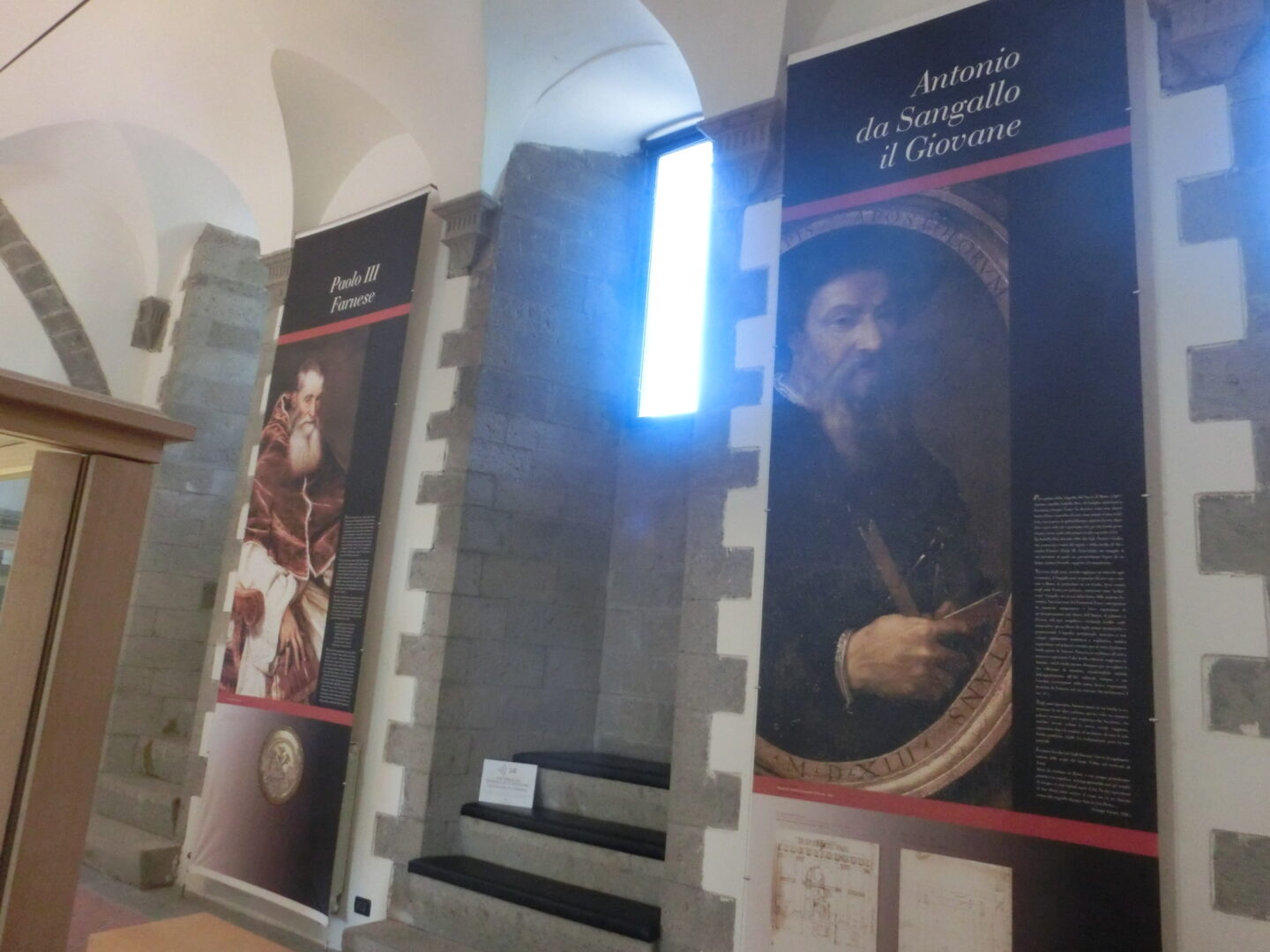 入場料はオーディオガイド(ただしイタリア語のみ)込み、また各パネルで跡地の解説を読むことができます。左奥は唯一残った塔で、こちらは近代に追加された階段で上まで上ることができ、望遠鏡でボルセーナ湖や遠くウンブリアやトスカーナの方まで見渡せるようになっていますよ。現存する建物の中は、ユリウス2世に改築のプロジェクトを任された建築家アントニオ・ダ・サンガッロの計画など、当時の建築についての博物館となっています。