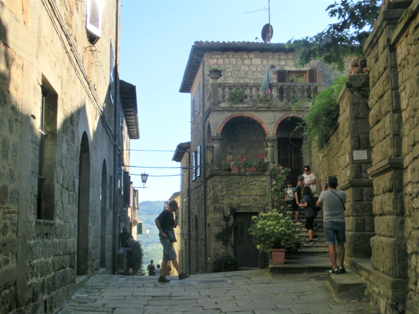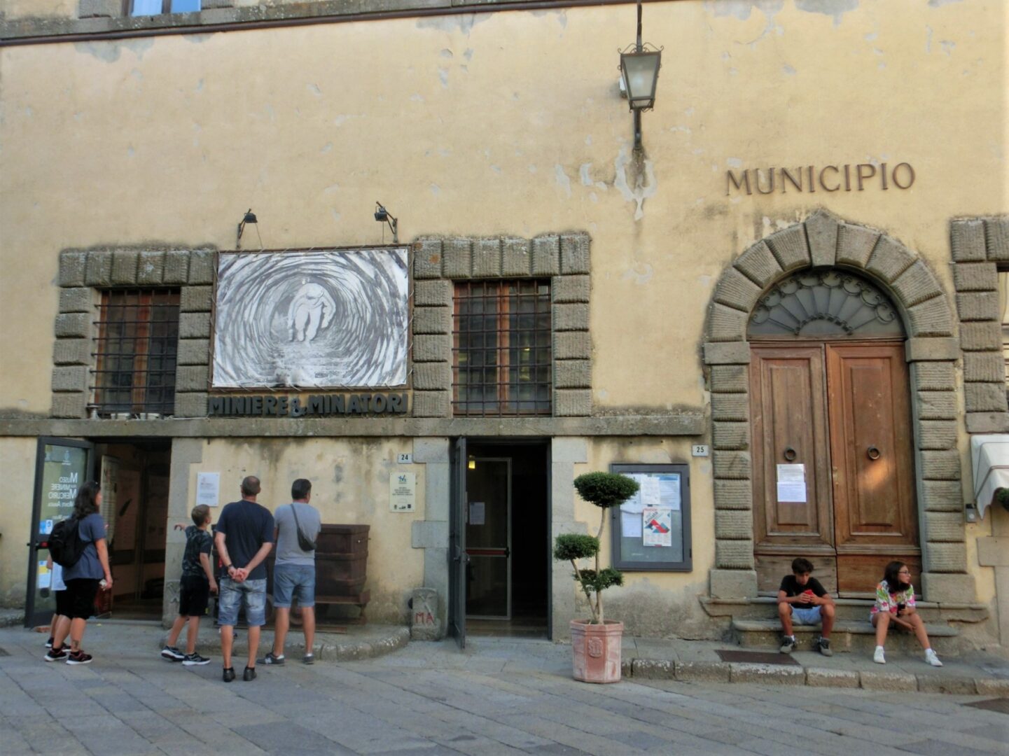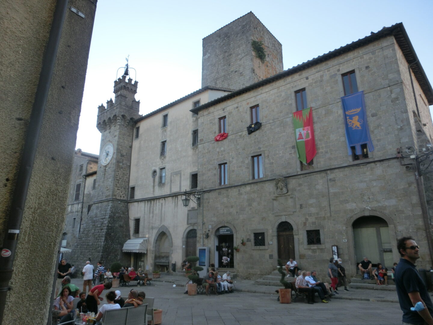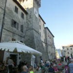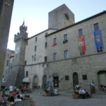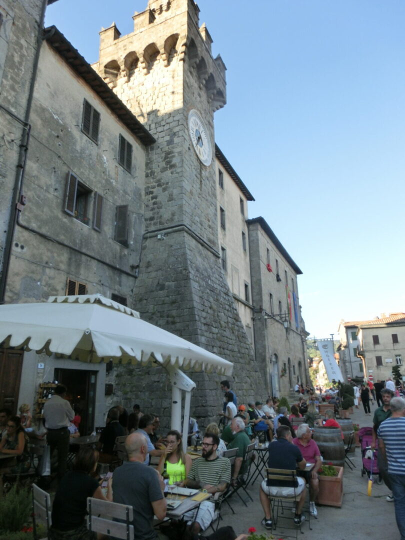 サンタ・フィオーラは890年の記録にも残るとても古い村で、中世にはアルドブランデスキ家の伯爵領となり、その領地は現在のカスティリオーネ・ドルチャ、カステル・デル・ピアーノやアルチドッソを含む広大なものでした。1200年代にはトスカーナの重要地となり、シエナのギベッリーナ派(皇帝派)の拠点となり、反対勢力でありアミアータ山のもう1つの有力地アッバディア・サン・サルヴァトーレと対抗していたそう。1300年代後半にはシエナの支配下に置かれて力を急速に失い、1400年代中にはスフォルツァ家との婚姻。一時はグイード・スフォルツァが芸術家などを呼び復興を試みますが、1624年にはトスカーナ公国に組み込まれます。そんな歴史がつまったのがこの広場で、アルドブランデスキ家時代の塔2つ、そしてスフォルツァ家時代の館。現在はツーリストインフォメーションや鉱山博物館になっています。