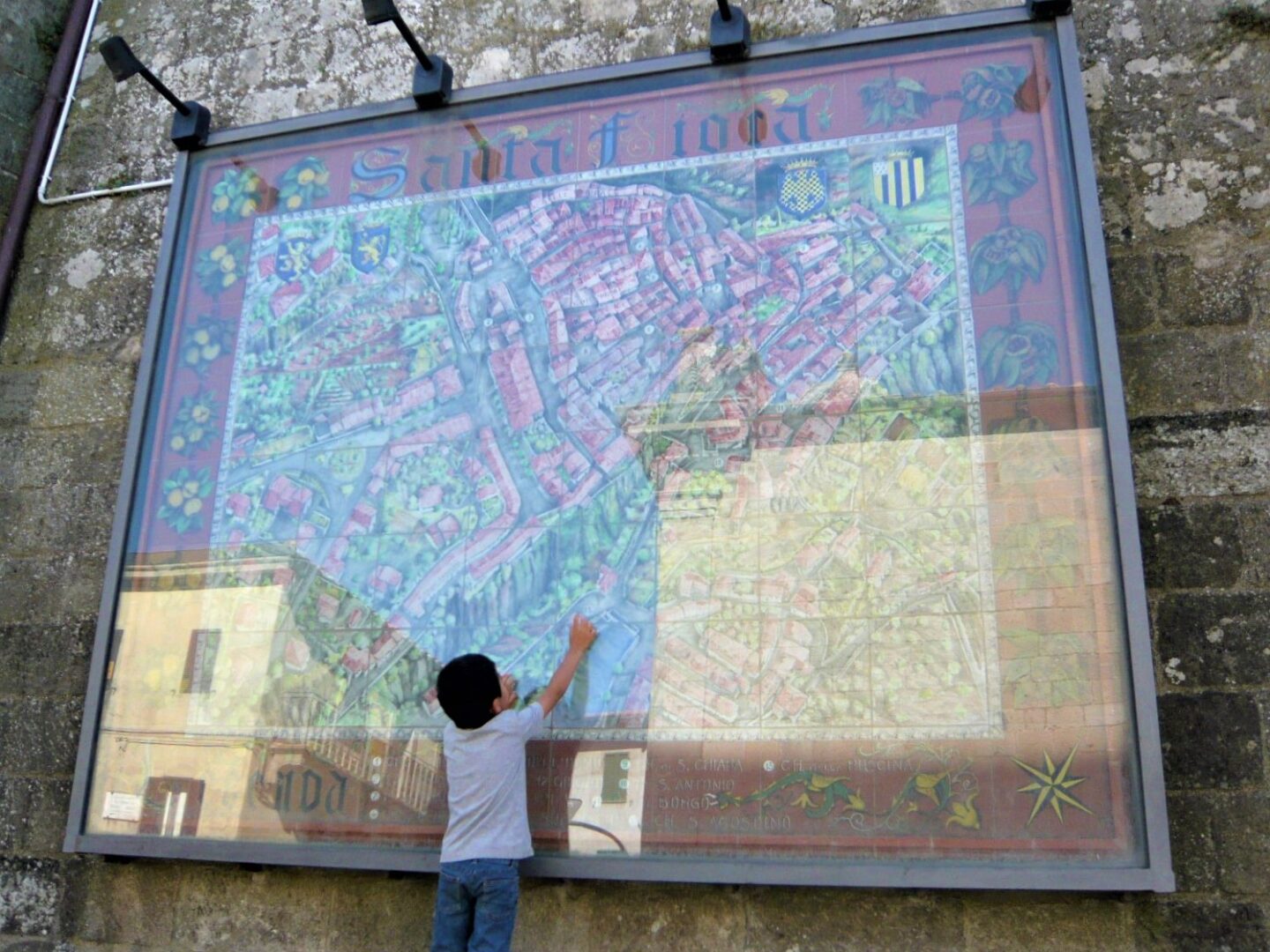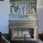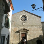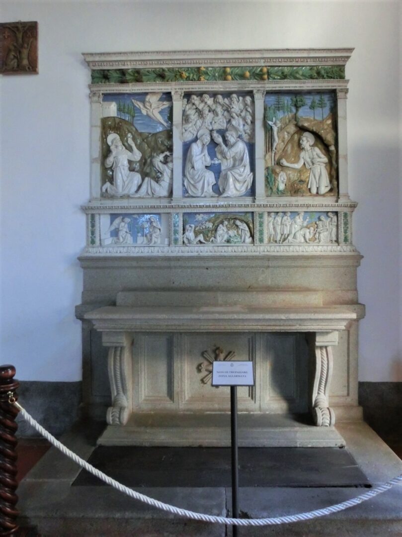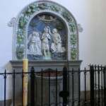 広場の鉱山博物館のちょうど前に出ている道・カロリーナ通りは、狭いですがメインストリート。飲食店や雑貨屋さんなどが並び、一番奥にはサンタ・フィオーラいちの教会、聖フローラとルチッラ教会があります。12世紀建設のロマネスク=ゴシック様式の教会ですが、その見どころはなんと・・・ロッビア工房の彩色テラコッタです。それも1つや2つではなく、コレクションと呼べるほどの豊富さ。