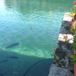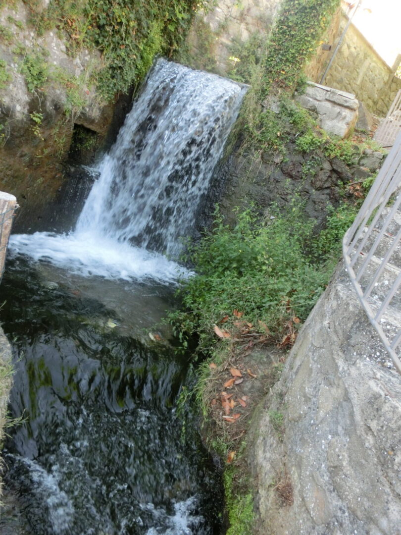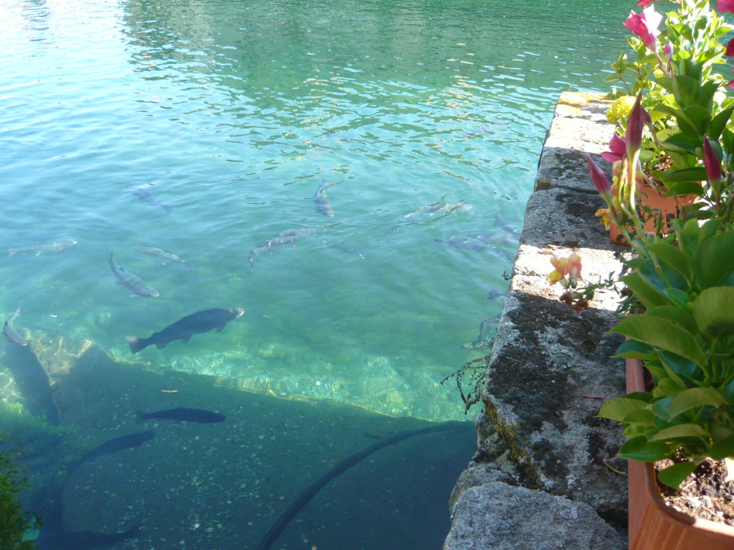 下り坂を下り、西方向にあるのが、下の旧市街の一番の見どころ・ぺスケリーア。13世紀頃から知られるこの池は、フィオーラ源泉所からの水をひいて元々はマスのいけすとして使われ、その後もスフォルツァ家の庭として使われていたそうです。実際、今も大きなマスがたくさんいました。入場料が1ユーロかかりますが、日陰も多くて清涼感があり、地元民や観光客の憩いの場になっています。中にはバールもありますので、ここで休憩も良いですね。