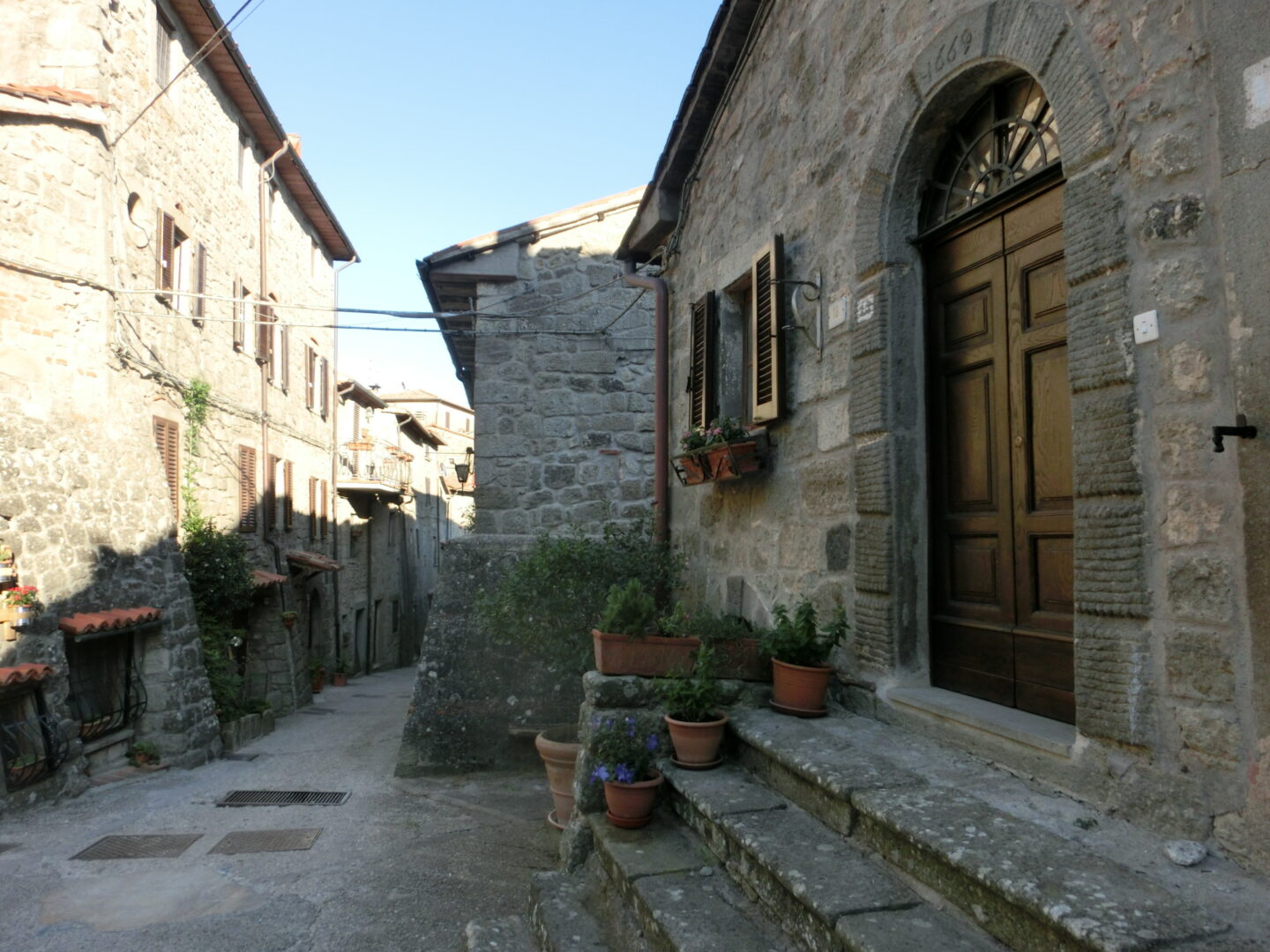 サンタ・フィオーラの中心に向かって車を走らせると、こんな風に島のようになった旧市街が見られます。旧市街の北東にあるこの大きな橋は、1800年代半ばに工事が行われた公共事業の1つ。この橋の旧市街よりにはエレベーターも設置され、下に通る州道ピティリアーノ=サンタ・フィオーラ線沿いの駐車場から上がってこられるようになっています(ピティリアーノまでは車で約50分)。