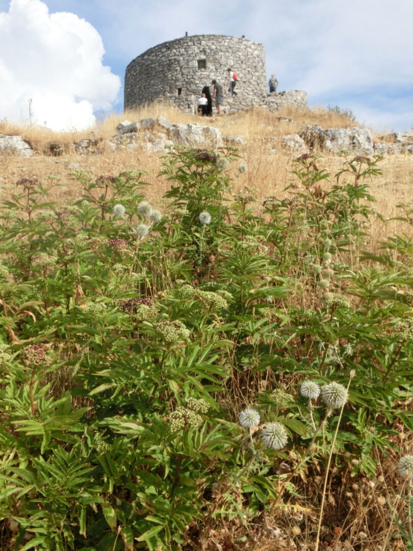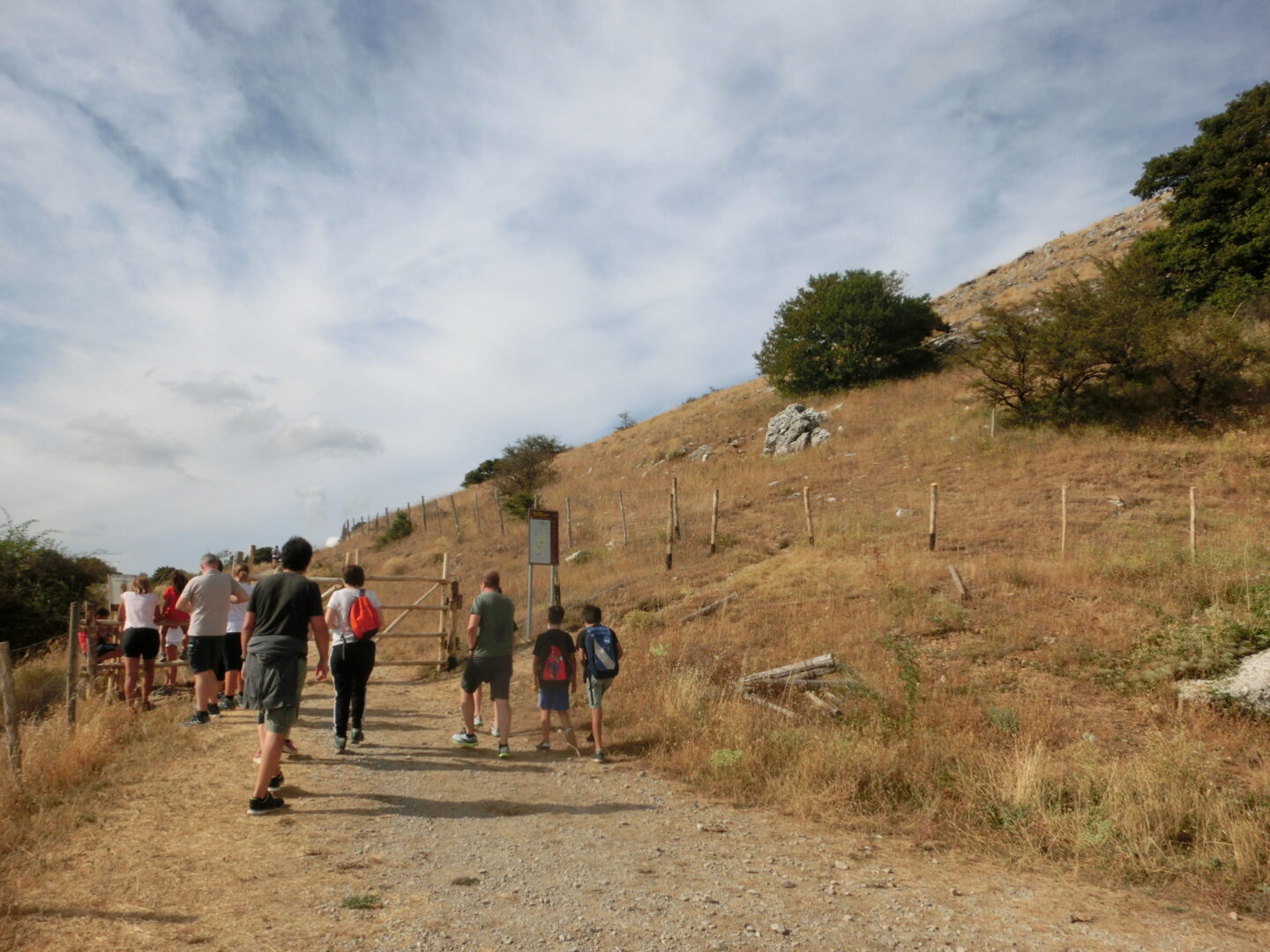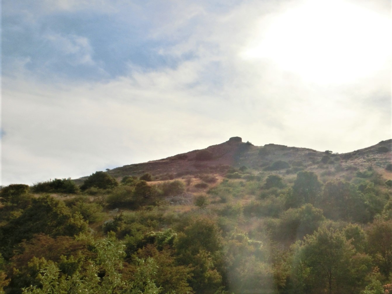 アミアータの南西部にあるモンテ・ラッブロ。SNSなどで要塞のような石造りのモニュメントを何度か見て、一度行ってみたかった所でした。そのモニュメントが何なのか?を調べてみると、ますます興味が・・・そしてこの夏のばーちゃん村滞在時、その地を何度も訪れている友人にタイミングよく誘われて、彼女のガイドで行くことができました。場所はアルチドッソという村のはずれなのですが、途中からは凸凹のオフロードをしばらく行くと、1193mの頂きにうっすらと建物が見えてきます。道の行きつく所には少しの駐車スペースがあり、そこから柵を越えて15分ほど坂を上ると・・・。