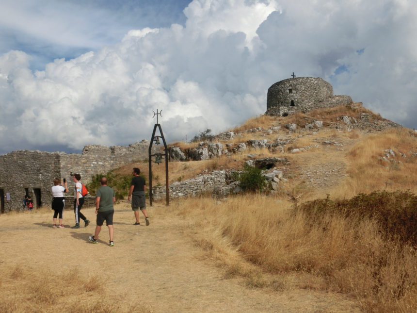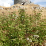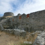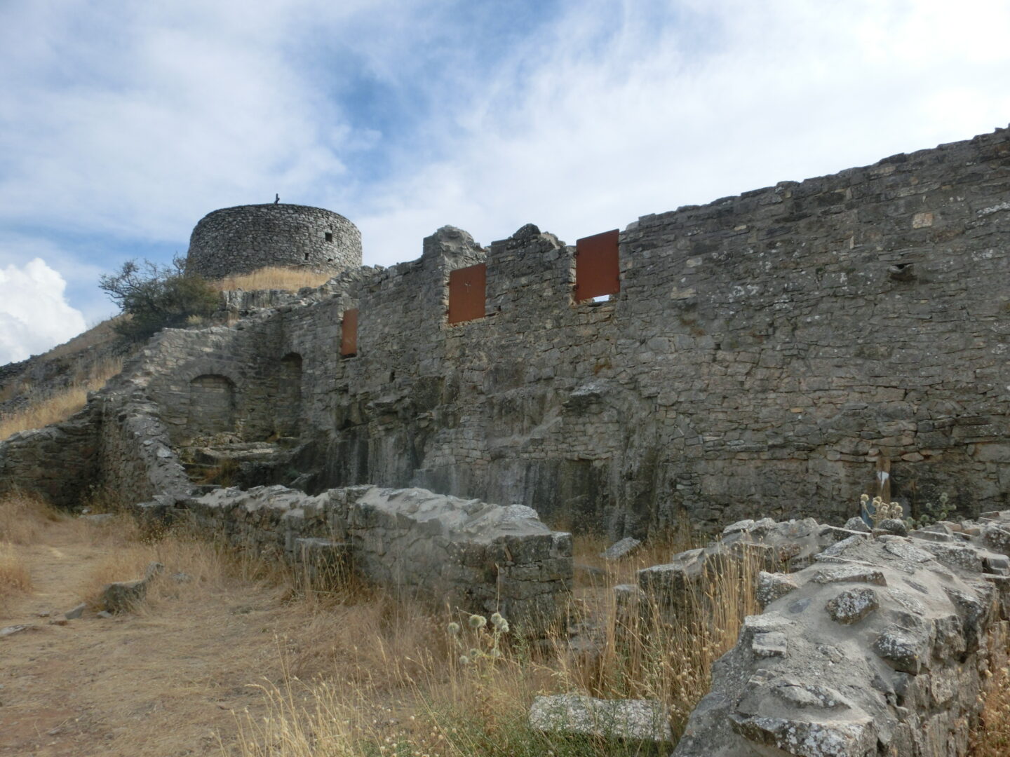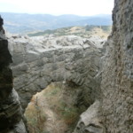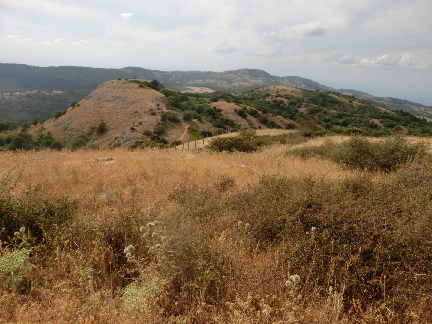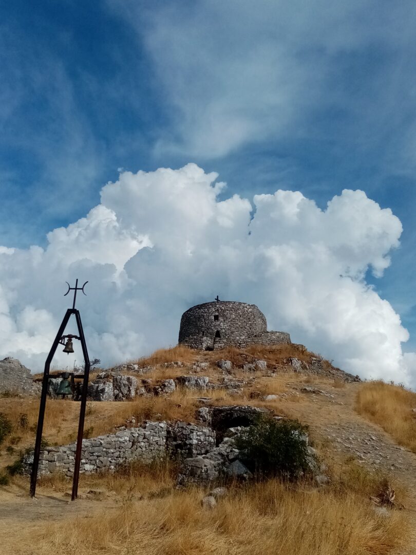 アミアータの南西部にあるモンテ・ラッブロ。SNSなどで要塞のような石造りのモニュメントを何度か見て、一度行ってみたかった所でした。そのモニュメントが何なのか?を調べてみると、ますます興味が・・・そしてこの夏のばーちゃん村滞在時、その地を何度も訪れている友人にタイミングよく誘われて、彼女のガイドで行くことができました。場所はアルチドッソという村のはずれなのですが、途中からは凸凹のオフロードをしばらく行くと、1193mの頂きにうっすらと建物が見えてきます。道の行きつく所には少しの駐車スペースがあり、そこから柵を越えて15分ほど坂を上ると・・・。