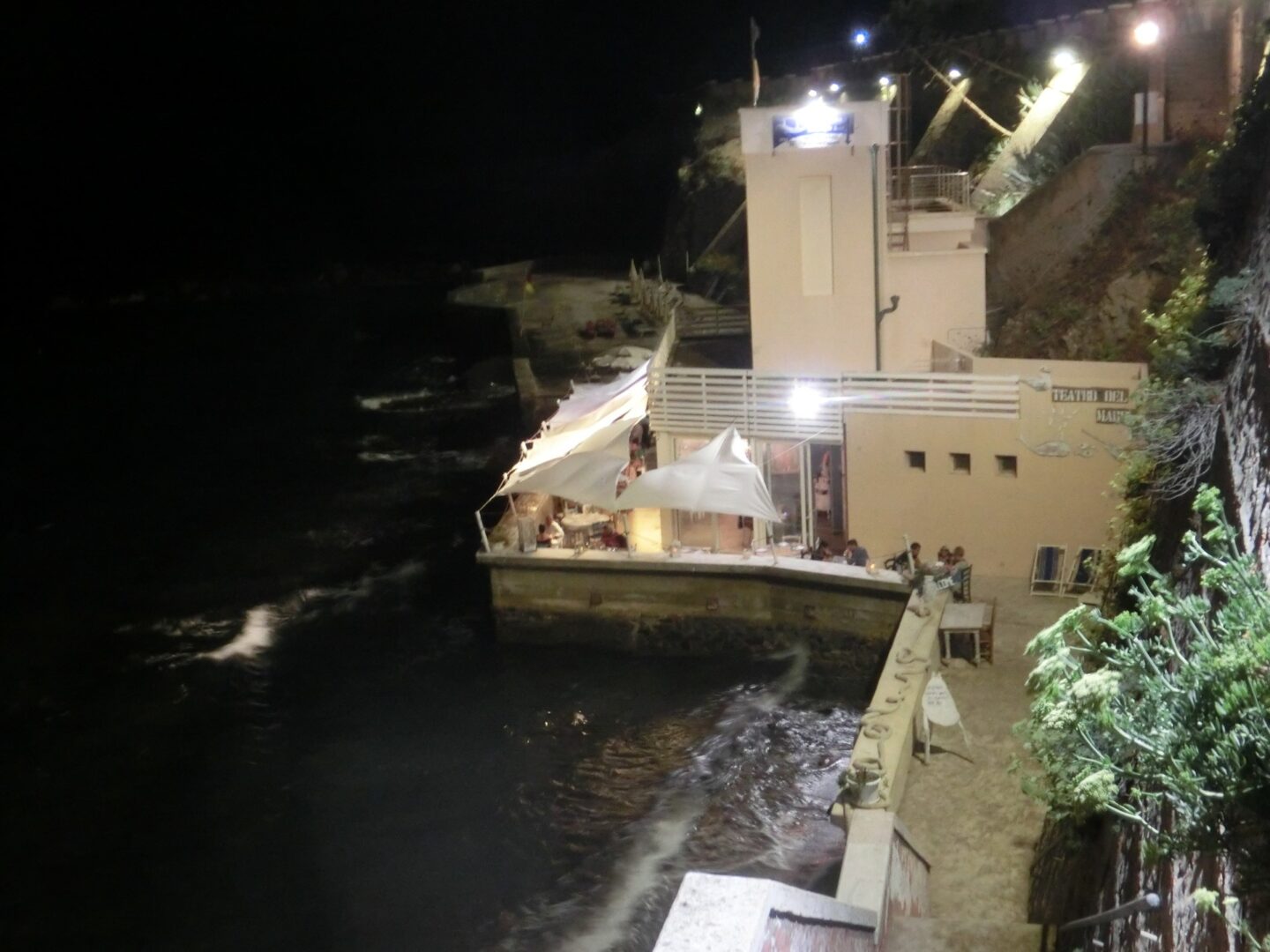 ピオンビーノでの食事は私の誕生日でもあったため、ロケーション重視で海沿い、ボーヴィオ広場周辺を検索しました。ランチがレストランなら夜は軽くここで、ランチがパニーノならレストランへ・・・と決めていたのですが、結局ランチがパニーノになったので、このレストランを予約!店名「海の劇場」と呼ぶにふさわしく、ボーヴィオ広場脇を下り、海の真横にあるテラスがメインホールです。ここは5月~9月までの夏限定営業ですが、朝から深夜2時まで開いており、バール、食事、飲みと幅広く使えるうえ、ライブなどのイベントも。そして、レストランの下にはビーチまで経営しているので、手軽に海を楽しみたい方にもおススメですよ。
