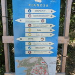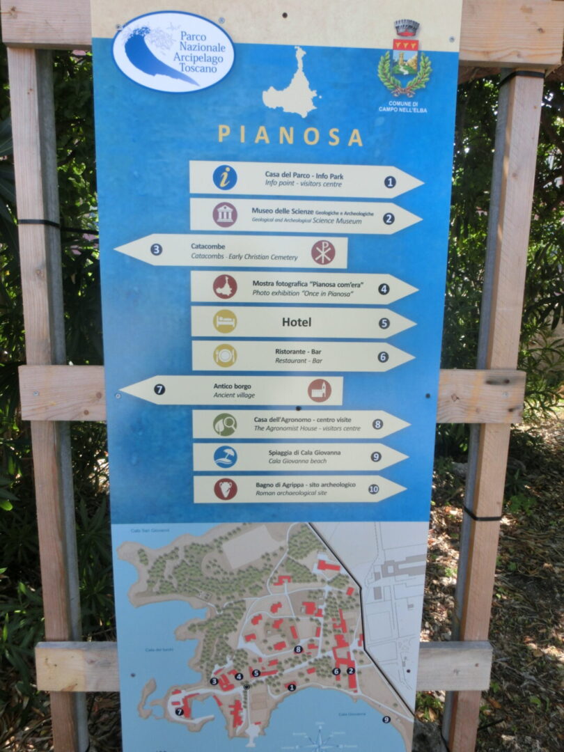 自由に行けるのは、港と港降りて右側にあるカーラ・ジョヴァンナビーチ、左側にある町のみ。あとはガイド付き有料の各エクスケーションになります。1時間半の町散歩から2時間~の古生物学トレッキング、遺跡トレッキング、バスやロバでの島観光、マウンテンバイクツアー、カヤックツアーなど。詳細はトスカーナ群島国立公園ピアノ―ザ島ページから、Look at the program of the guided tripsをクリックすると英語のプログラムPDFがダウンロードできます(現在のリンクは2020年がリンクされていますので、2021年度以降はピアノ―ザ島ページを参照ください)。