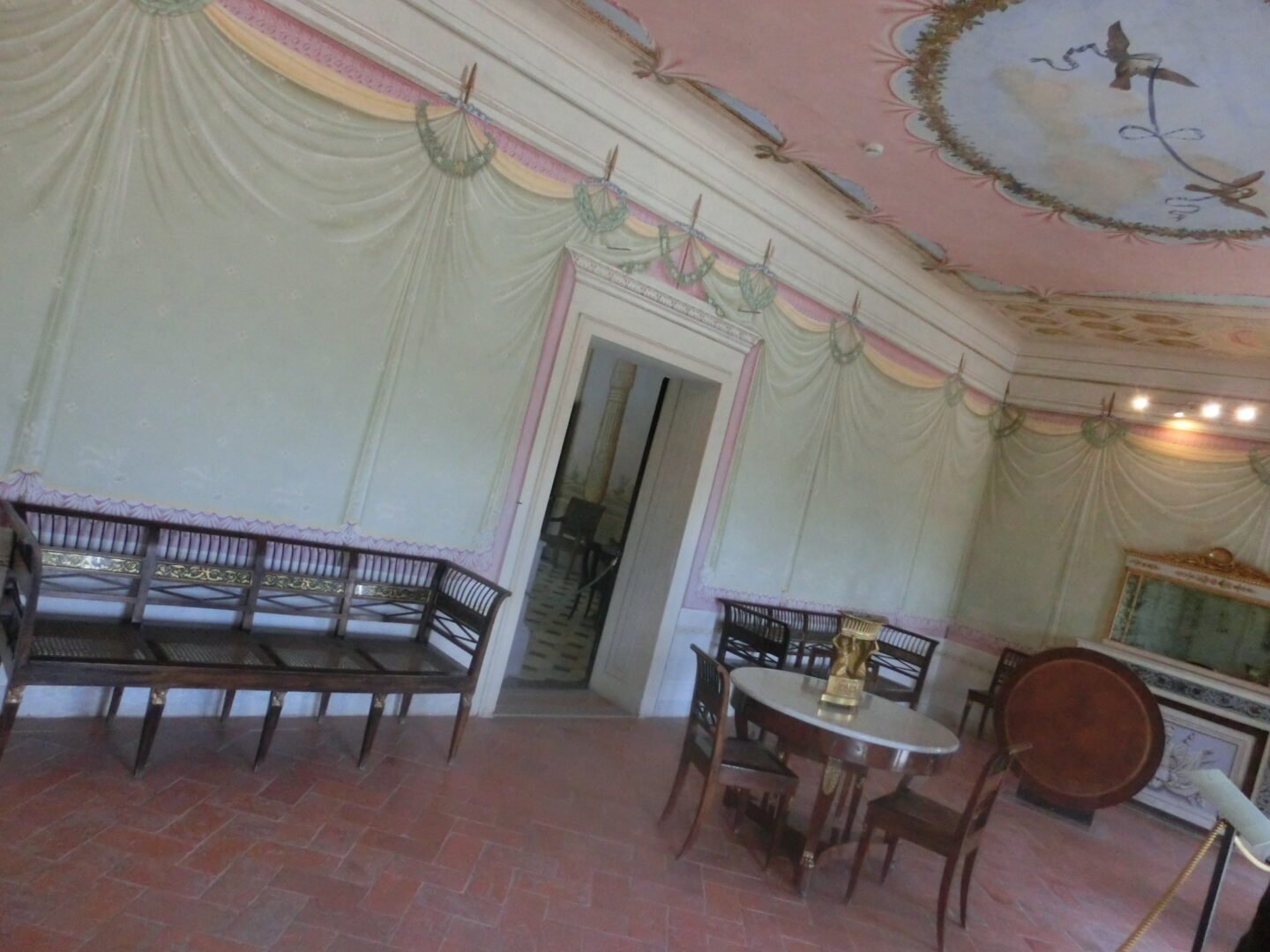外観と同じく、中も豪華絢爛!ではないですが、上品で緻密なインテリアになっています。こちらはナポレオンの寝室・・・ベッド、ちっさ!!!思わずナポレオンの身長を調べてしまった私ですが、身長は168㎝。私とほぼ同じくらいでこのベッド・・・もちろんここに寝転べることはできなかったのですが、頭も足も両方ついてしまいそう。丸まって寝る人やったんかな?ちなみに、壁のフレスコ画はトリノの画家ヴィンチェンツォ・アントニオ・レヴェッリによるもの。