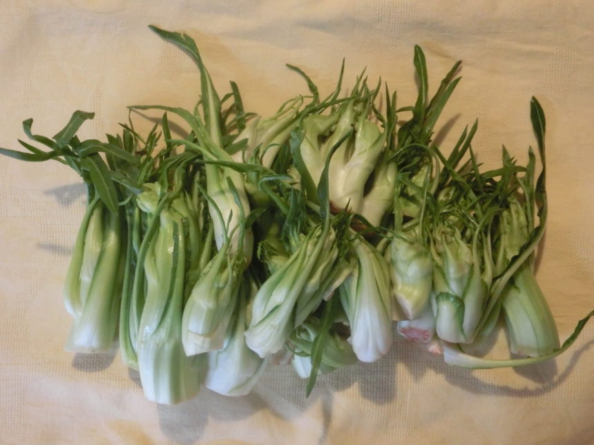 これがプンタレッラがチコリの部位だと知った動画(笑)。なので、今回のようにプンタレッラだけで売ってなくても、内側をチェックしてチコリを買えばいいってことですね。売っていたのはプンタレッラだけだったのですが、動画よりもかなり短いです。ともあれ、動画に従って下の固い部分を取り、縦に半分に切って、
