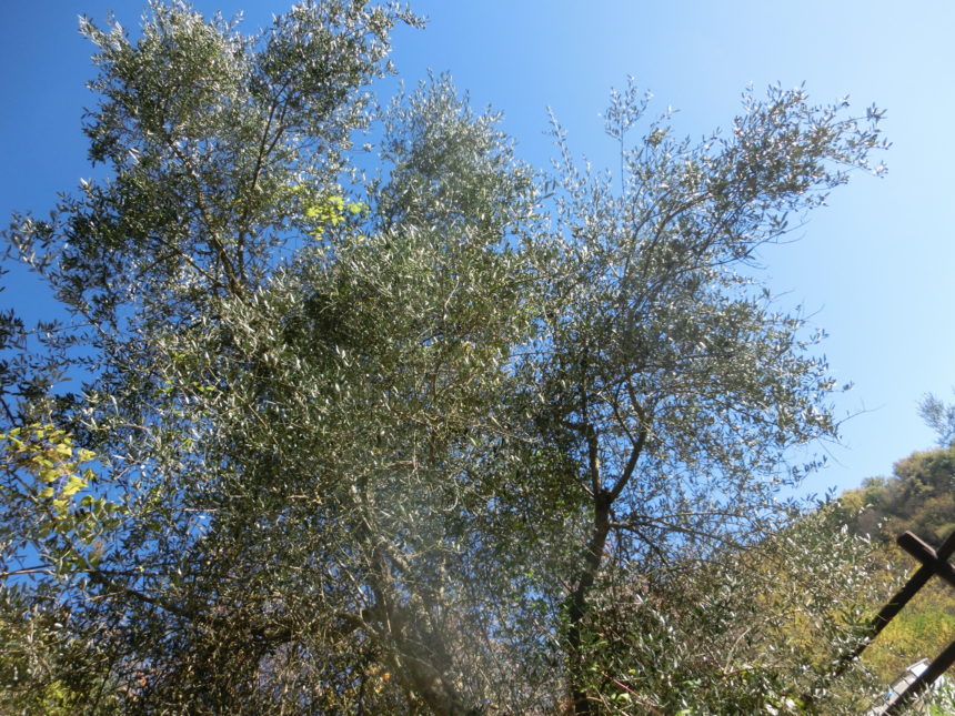 うちには前の庭に大きなオリーブの木があり、それは毎年少なからず実をつけてくれるので、多い年はオイルにしたり、少なくても塩水漬けにしたりしています。しかし裏庭のは、そこまで大きくもなければ、あまりに長期放置しすぎて周りの雑草も藪みたいになって近づけないのもあり、剪定もしたことがなく実をつけたことは一度もなかったのですが・・・ダンナの一言が気になり、裏庭の上の方までてくてくと上って見てみることに。