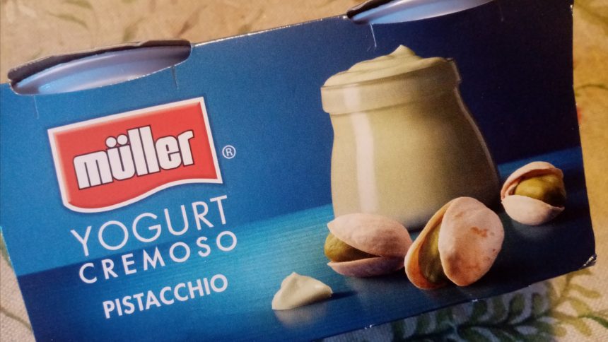 イタリアでも超メジャーなドイツのヨーグルトメーカー・ミュラー。とにかくバリエーションが多いのですが、先日、ピスタチオなど変わり種ヨーグルトだけ?の2個パックが超お買い得だったのです。確か2個で0.69ユーロ(約90円)!!・・・という訳で魔が差し?興味本位でピスタチオだけ購入してみました。
