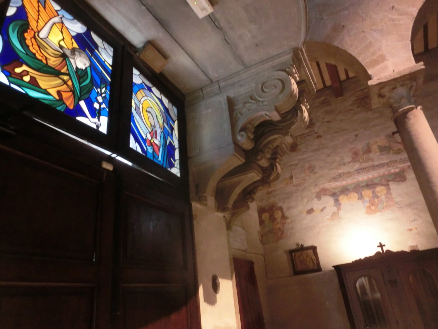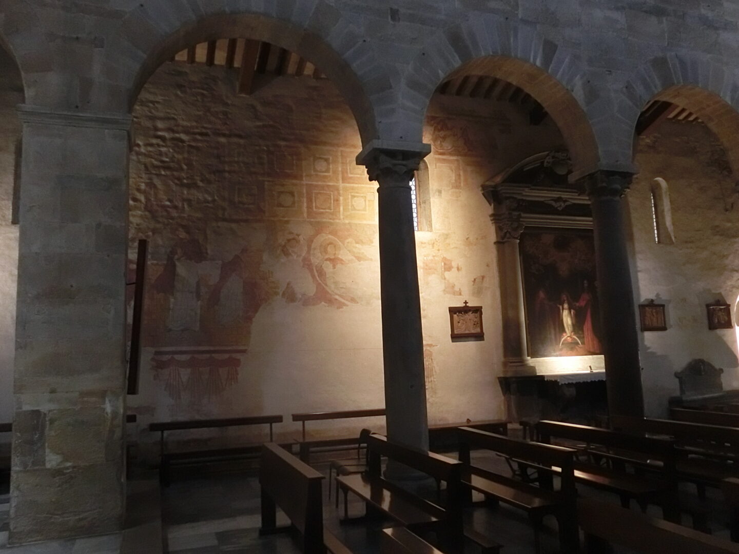 フレスコ画や後陣にある木製の十字架も1200年代のものと、そして祭壇やベンチなども見ごたえがあり、村の中に入る前にかなり興奮してしまいました。そしてロマネスク教会で好きな後陣を外部から、と思って歩いて行ったのですが、個人宅?の庭となっていて木も茂っており、見ることができず残念!