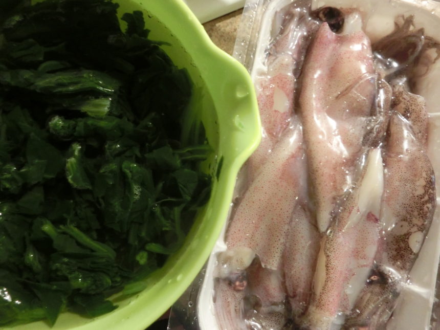 ◎イカ・300g ◎ほうれん草(またはビエートラ)・500g ◎ニンニク・3かけ ◎トマトピューレ・200㎖ ◎オリーブオイル、塩、ペペロンチーノ・適量