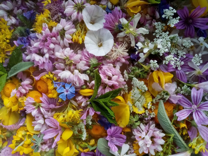 初めての昨年は想像よりもさらに素敵な体験だったので、今年も少し前から何を入れようかな、と考えながら裏山やエルダーフラワーを採りに行った墓地裏の森などを散策していたのですが・・・今年は肝心の西洋オトギリソウが少ない!更に数日前?に裏山に除草機が履いたらしく、道の脇は全滅・・・ということで、土壁にしがみつきながら、除草機が入らなかった所のお花を頂きました。最近の野の花ブーケでも活躍した淡いピンクの子たちが主役。そして庭のラベンダーやミント、セージ、自生のフェンネルの葉をたっぷりと。