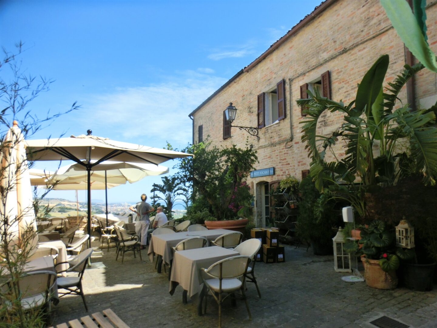 やはり、この海のパノラマ!行った日は快晴で、空の青、海の青がまぶしいほど。左前にあるのは、ポルト・サン・ジョルジョ。マルケ南部のリゾート地としても知られており、村の最寄り駅もここにあります。