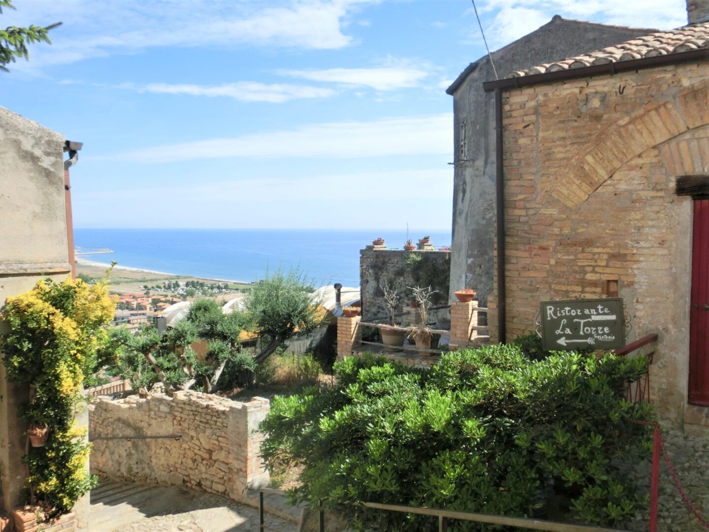 海沿いの高台にある立地から、起源はピチェーノ族(現在のマルケの大部分とアブルッツォ州北部にいた古代民族)から、その後ローマ時代~中世を通じても、海の防衛や交易の重要地でした。要塞はほとんど残っていませんが、村の北側の茂みを少しゆくと、こんな風に塔が1つ残っています。