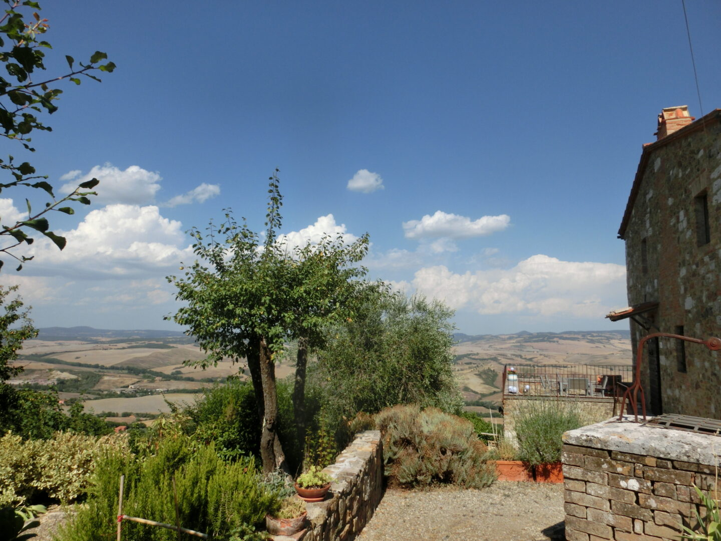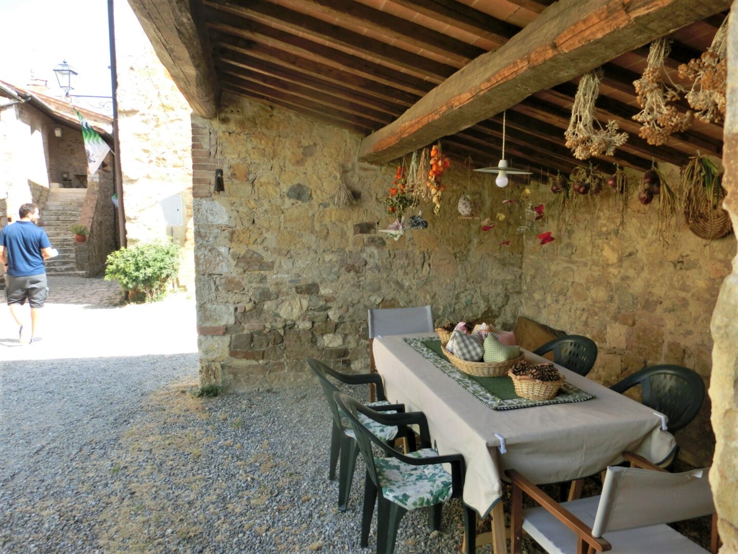 教会の左横の古の門からは、オルチャ渓谷の絶景が。そして再び集落の中に戻っても、中世以降の建物がそのまま残り、鳥やセミの声しか聞こえない静寂の中に身を置くと、なん百年年も前にタイムスリップしたような錯覚におちいります。夏は車でこないと辛いですが、それ以外の気持ちの良い季節はバーニョ・ヴィニョ―ニからプチトレッキングがおススメです。トレッキング愛好者の方は、逆側に抜けてサン・クリーリコ・ドルチャにも行くことができます。集落にお店はないですが、塔の脇にある公共水道は飲用できますので、ここで水分補給してくださいね。
