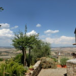 ヴィニョ―ニの城塞は、11世紀はサンタンティモ修道院の管理下にありましたが、その後、12世紀からはロッカ・ドルチャの領主・ティニョージ家、続いてサリンべーニ家へ渡り、14世紀に入ってやっとシエナ共和国の支配下に置かれました。集落に着くとまず見えるのが塔。ここは標高約500mで、ここからはオルチャ渓谷の雄大な眺めと同時に、目の前にはロッカ・ドルチャにあるテンテンナーノ要塞、さらに奥には、オルチャ渓谷でも一番の高さを誇るラディコーファニの要塞も見えます。エルバ島のヴォルテッライオ要塞のガイドさんが言っていたように、エルバ島と同じく、オルチャ渓谷のこのエリアも要塞同士で交信ができるようになっていたのでしょう。