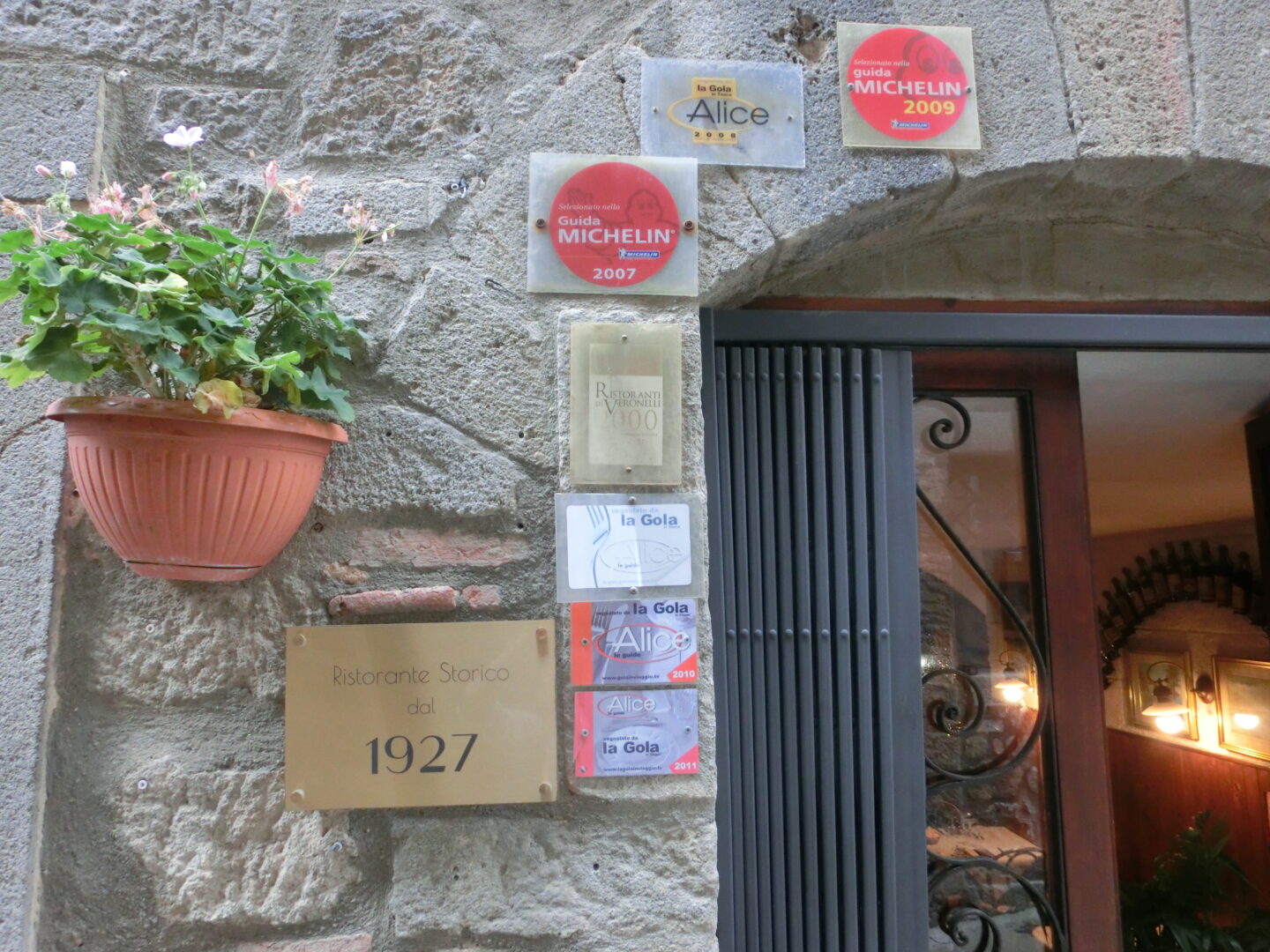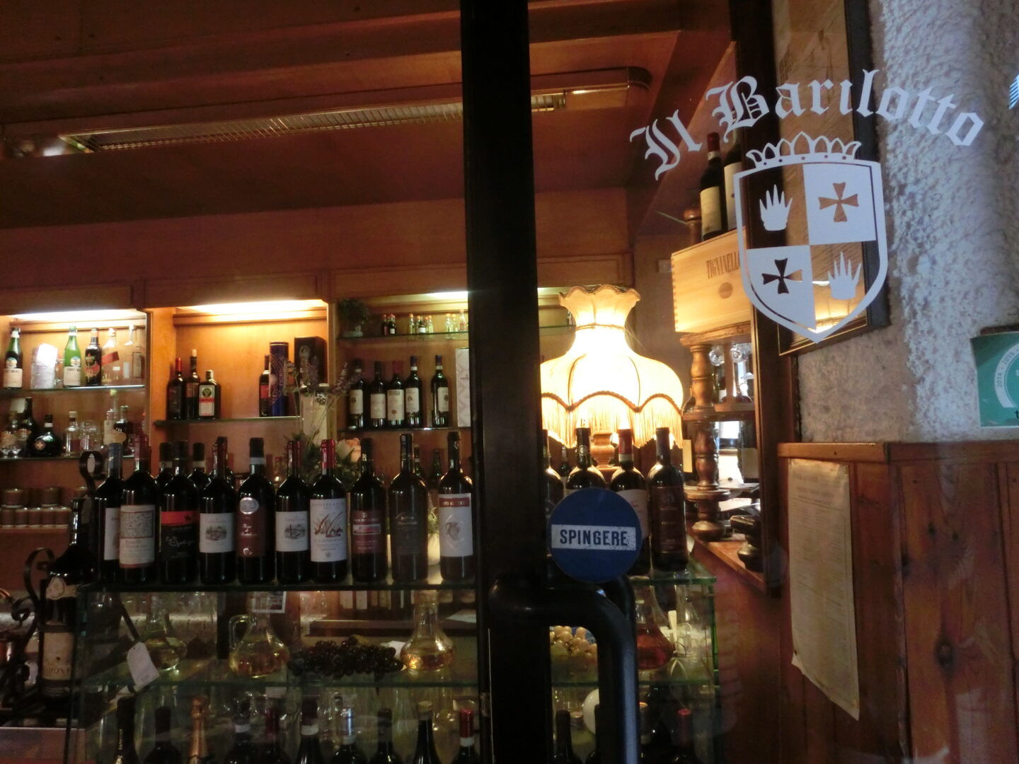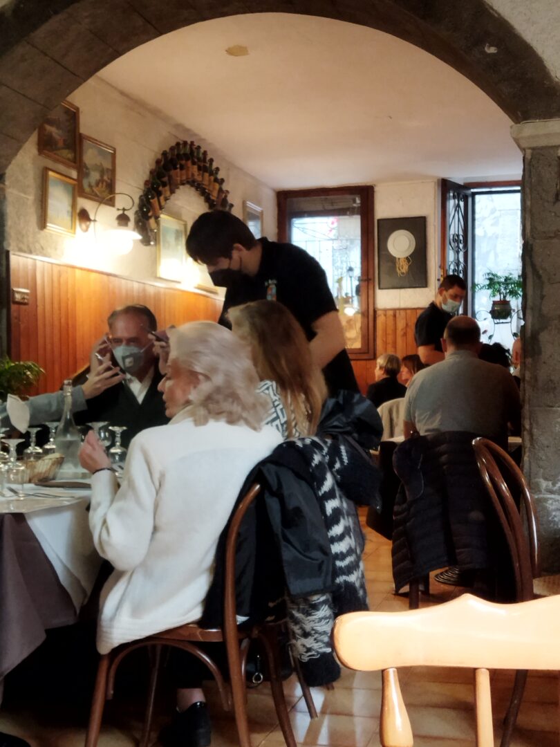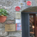 今回は秋の栗祭りの機会に行ってみました。コロナの影響でアミアータ山の村の秋祭りは中止か縮小で例年の賑わいがなかったのは残念でしたが、美しい秋の風景、そして前から入ってみたかったレストランに行くことができました。それがこちら、イル・バリオット。サンタ・フィオーラの旧市街は上下に分かれていますが、このお店は上のカステッロ地区、メインのガリバルディ広場からサンタ・フィオーラとサンタ・ルチッラ教会を結ぶカロリーナ通りにあります。カロリーナ通りはTOP写真のように細いですが、各種レストラン、食材店などいわばサンタ・フィオーラ旧市街のメインストリート。趣のある石造りの建物にレトロな看板、それもそのはず、ここは1927年創業の老舗のレストランなのです。