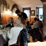 優しいスタッフは、「デリケートなポルチーニから食べてね、イノシシから食べちゃうと味が分からなくなるから」とアドバイスをくれ、その通りに~。栗ペーストの具は栗のこっくりした甘みがあるのですが、ポルチーニだと絶妙の組み合わせ、イノシシラグーとはコントラストくっきりで全く違う2つのテイストを頂きました。横のグループではこの店おススメのこのラヴィオリを注文した人がいなかったので、注文をとっていた別のスタッフが「誰も頼まないの?あのシニョーラが食べてるやつですよ」と言ったもんだから、「シニョーラ、どう?」と突然インタビュー?に・笑。「ちょっと変わってるけど美味しいですよ」とおススメしたら、この男性が注文してくれました(店に貢献したかしら?)。