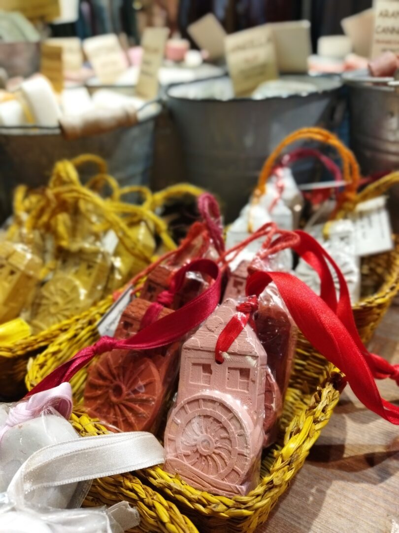 そしてこのテラコッタの小物、なんだと思います?テラコッタにエッセンシャルオイルがしみ込ませてあるので、タンスや靴箱などに吊るしておけるものなのです。1年くらいで香りは消えてしまうそうなのですが、エッセンシャルオイルを購入して10滴くらいしみ込ませ、袋に2日間くらいおいて閉じ込めておけば、またしばらく香り効果が続くそう。なのでクリプレにはそれぞれに合いそうなソープ3つ、ボルゲットに残る水車の形をしたテラコッタとエッセンシャルオイルを詰めてもらいました。自分用にも買えばよかった!とあとで思いましたが、遠い将来?またここのホテルにダンナと戻ってくるし?と納得させていたら、どうやらオンライン購入もできるよう。