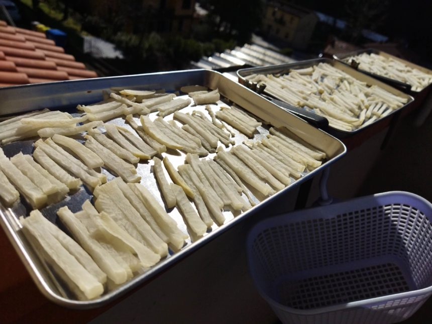 スーパーの大根があまりに貧弱なため、フィレンツェで立派な大根を2本調達。本当な干物用でぶら下げられる網籠があればよいのですが、まずは試しに金属トレイの上にのせ、日当たりのよいベランダに置いてました。すでに作っている友人のアドバイスで細すぎないように切ったのですが、ホント、収縮がすごい!大根ってほとんどが水分なんだな、と実感。外で6時間ほど干しただけではまだまだ柔らかいので、夜は暖房パネルの上に移動させ、それでも足りないので翌日はベランダへ・・・を繰り返します。切った細さによりますが、これを3日~5日くらい繰り返すと、かなりそれっぽく。トレイが3枚しかないので、できたものをタッパーに移動し、また切って干す、の繰り返しを続け、2本分全部できたのはナント10日後のことでした。