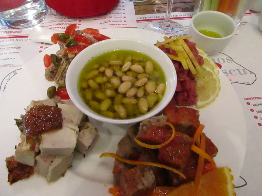 お肉屋さんを見たい方は、フィレンツェからバスで来た場合、進行方向に歩いてワインボトルがででんと立つ広場を通り過ぎた後、左向かいの坂道を上ってすぐ左側。ここでは、レストランに入る前にカウンターでおつまみ、そしてワイン飲む?とワインまで提供してくれます。お肉に使う塩やラードペーストなど、お土産も買えますよ。肉屋から入った場合、カウンター脇の隠しドア?から入り席に案内されます。