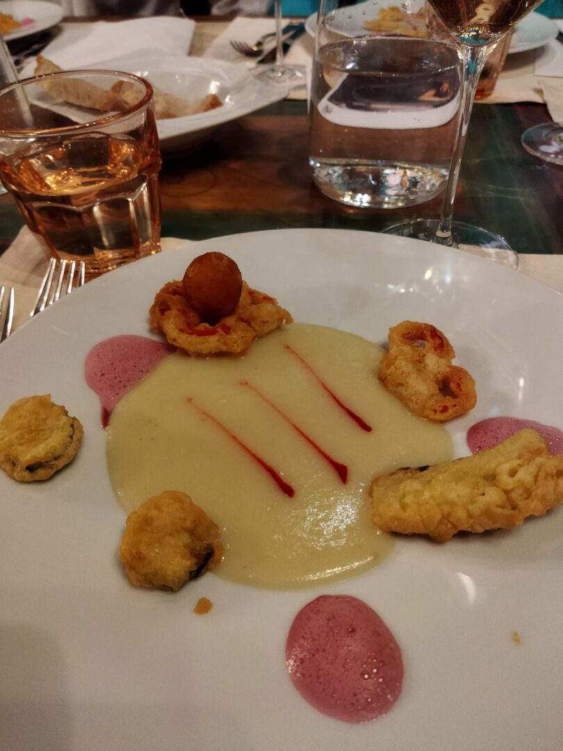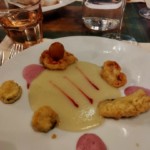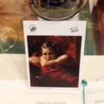 料理の数・ワインの数・絵画の数も4つ。料理の前にまずは1枚のカードが配られ、それに組み合わせられるワインと絵画が紹介されています。最初に店主から料理の説明、そしてワインを選んだソムリエからワインの説明、絵画を選んだ美術ガイドから絵画の説明と続きます。そしてテーブルは、さらに各々に合わせた詩まで。上の写真は前菜の絵画で、ジョン・ウィリアム・ウォーターハウスの「ボーラ」という1903年の作品です。合わせたワインはプロセッコで、料理はニンニクピューレのブルーベリーソースと野菜のフリット添え。
