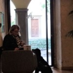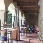 新しいお店はサンタンブロージョ教会の左横、2年もの構想とリノヴェーションを経て2021年にオープンしました。お店前と横にも外席ありですが、まずは中の様子を伺ってみましょう。高い天井で奥に長いスペース。そして右側に2つのホールと、その奥に屋外席があります。屋外席は建物の中庭・・・なんとこのお店、かつて1300年代に建設の修道院の食堂と中庭だったところで、。ヴォールト天井や壁の彫刻などのムードがまた良いんです!