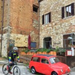 まずは村の下にあるサン・ビアージョ教会へ。ここから坂道を一気にのぼって村の中心であるグランデ広場に行くか、周りの車道を周って村の下の門から入り、旧市街を見ながらグランデ広場に向かうか?をフランチェスコが提案してくれ、お客様は後者を希望。これも簡単なようですが、イタリアでは自転車=車と同じ扱いなので、車道で一方通行があるところは逆行できなかったりも。それを知らないとうまく回れないので、ガイドさんがいてくれると効率よく提案してくれるので本当に助かります。