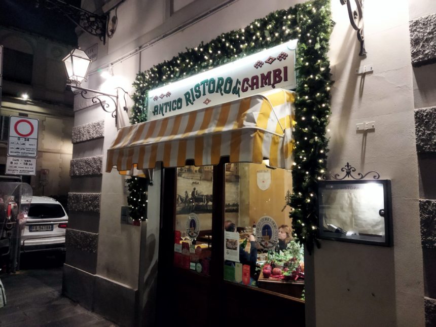 12月8日の祝日の連休、ローマの友人家族がフィレンツェ観光に来ていて、急きょ夕食を共にすることになったのですが……中心のレストランはどこも満席!そこで思い出したのが、前から行きたかったこのレストラン、 Antica Ristoro di Cambi 。サンフレディアーノ地区でも西側で観光客は多くないだろうし、何よりもホールが広かった覚えが……幸い最後の外席が予約でき、期待して店に向かいました。