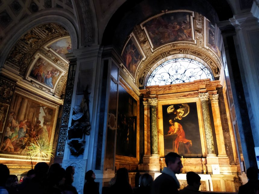 観光名所でもあるナヴォ―ナ広場至近。この教会の左奥には、カラヴァッジョの代表作ともいえる「聖マタイ三部作」とも呼ばれる3作品が残っています。ここを訪れるほとんどの人の目的はこれらの作品で、そこだけ人だかりができているので場所はすぐに分かると思います。コインを入れて照明をつけるシステムですが、継続して誰かが証明をつけてくれるほど、いつ行っても鑑賞に来る人が絶えません。