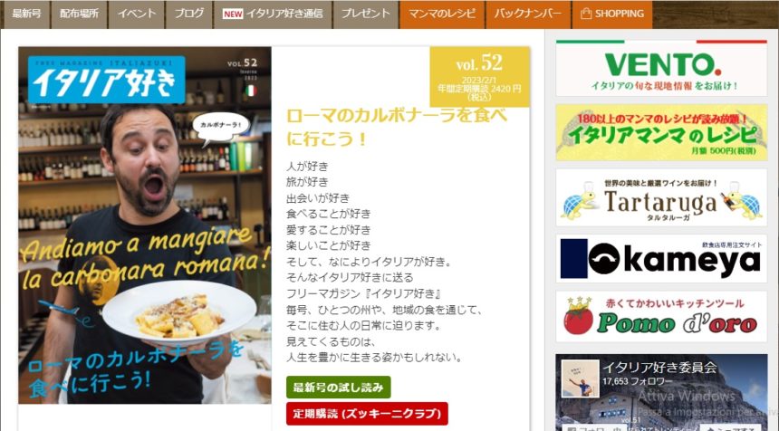 ちょっと通なイタリア好きの方ならご存じの、ちょっと通なイタリア料理や雑貨を扱っているお店なら置いてある、そんなフリーマガジン、イタリア好き。