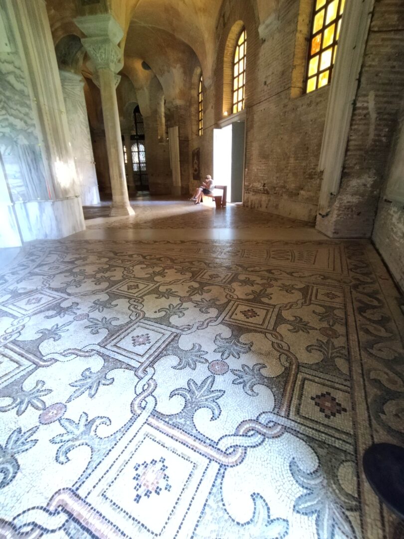殉教者聖ヴィターレに捧げられた八角形の礼拝堂。東ゴート王国時代の起工で547年前後にほぼ完成するも、ビザンツ皇帝ユスティニアヌス1世やベネディクト会によって改修されました。天井がとても高い薄暗いなか、ひときわ光を放っているのが主祭壇のある空間。後陣はキリストを中心にした楽園、左右には皇帝ユスティニアヌと皇妃テオドラのモザイク、天井には前回投稿のサンタンドレア礼拝堂と同じく4人の天使が中心の円を支えています。上の金銀キラキラのモザイクだけでなく、床のモザイクも圧巻!