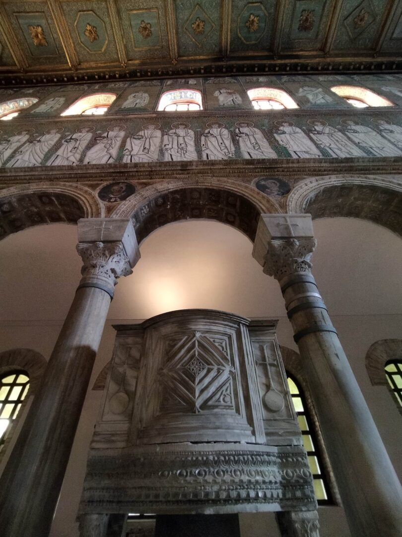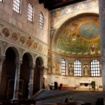5世紀末~6世紀前半、東ゴート国王・テオドリックの建造で、3身廊のアーチの上にずらりと並ぶ殉教者たちが印象的です。かつてここの床に敷き詰められていたモザイクは、度々起こった高潮の被害のために、16世紀に床面が1.2m以上も持ち上げられたので、残念ながら見ることはできません。右隣、出口になっている中庭もとても素敵です(ギャラリーに写真あり)。