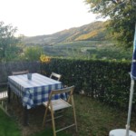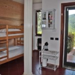 お部屋はシンプルにダブルベッド、反対側に2段ベッドもあるので合計4人(+エキストラベッドで最大5人)まで宿泊可能。シャワートイレに続く廊下には小さな冷蔵庫もあるので、キッチンはありませんがハムやチーズ、お惣菜などを買って食事も可能です。またカプセルに入ったミルクでカップチーノもできるエスプレッソマシーンや電気ポット、ティーバッグもありますので、こちらも何か買ってくれば朝ごはんもできます。緑に囲まれた小さなテラスにはテーブル・椅子もあるので、外でゆったりしたり食事にも使えます。
