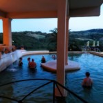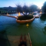 とはいえ、温泉プールエリアに入ったらテンション爆あがりで、奥のテラス下にある更衣室ですぐに着替え、さっそく温泉ヘ。イタリアの温泉はぬるいのが普通ですが、ここの熱い方のプールは熱い湯が好きな日本人の私も満足の良い湯加減。49度の源泉がそのまま?入ってきていて小さめのプールなので、湯温がキープされてるのでしょうね。とはいえ日本の露天風呂よりはぬるめで38〜35度なのに、義妹には熱すぎるらしく、数分で32〜28度のぬるい方のプールへ。
