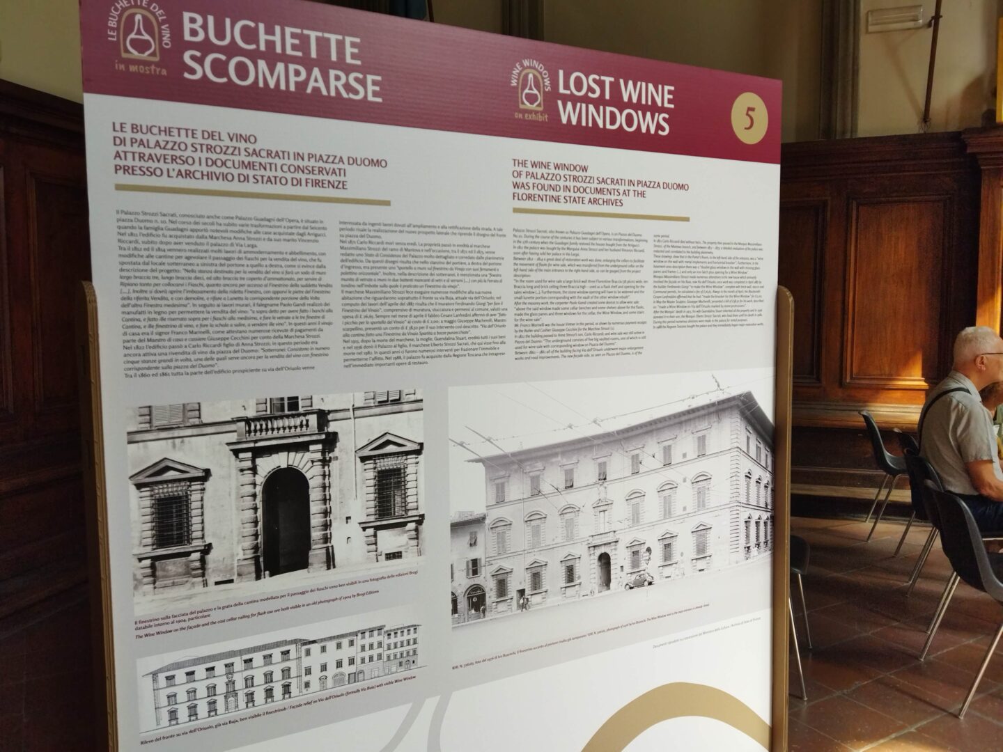 TOP写真は駅とドゥオモ間くらいの路地にある有名なワインの穴。建物は「バルトリーニ・サリンべーニ・ワイナリー」で、このパネルには開店時間が記載されています。当時のフィレンツェの法律で、ワイン生産者が少量を直接消費者に販売する場合は税金が免除されたため、そのやりとりをするための「ワインの穴」が誕生しました。ワインの穴のほとんどは23×36㎝、販売上限であったフィアスコがちょうど1本通れる大きさです。フィアスコとは、ボトルを守るために藁で下部が包まれたぷくっと膨らんだワインの瓶。トスカーナ、特にキアンティワインでよく使われるボトルです。今では小さいサイズもありますが、昔ながらのサイズは1.5リットルの大瓶です。