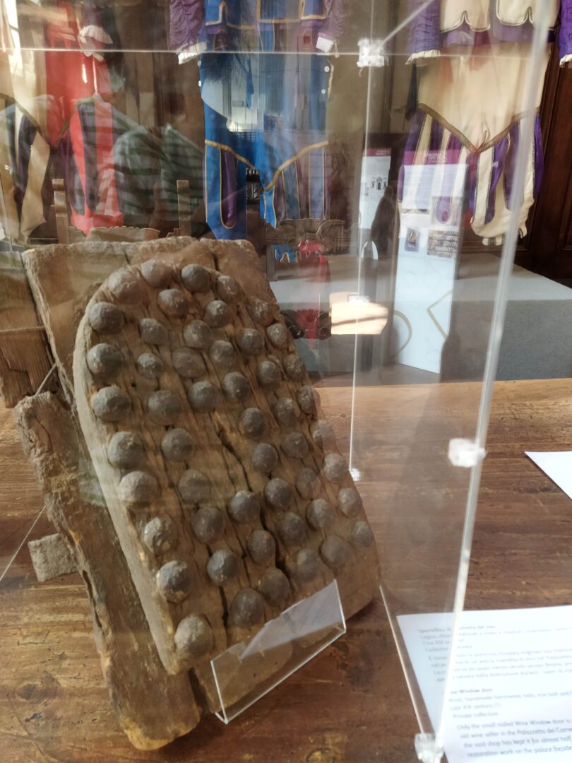 会場はレプッブリカ広場近くのパルテ・グエルファ邸。13世紀起源の歴史的な建物で、現在は市役所の部署、カルチョ・ストーリコ本部など、歴史文化団体の事務所が入っています。外には展示会の旗がたち、写真を撮っていたら「展示会やってるよ!」と勧誘され、階段までエスコートしてもらうというVIP?待遇!いやいや、最終日でかつ「たくさんの人に見て欲しい!」という協会の人の情熱が感じられました。