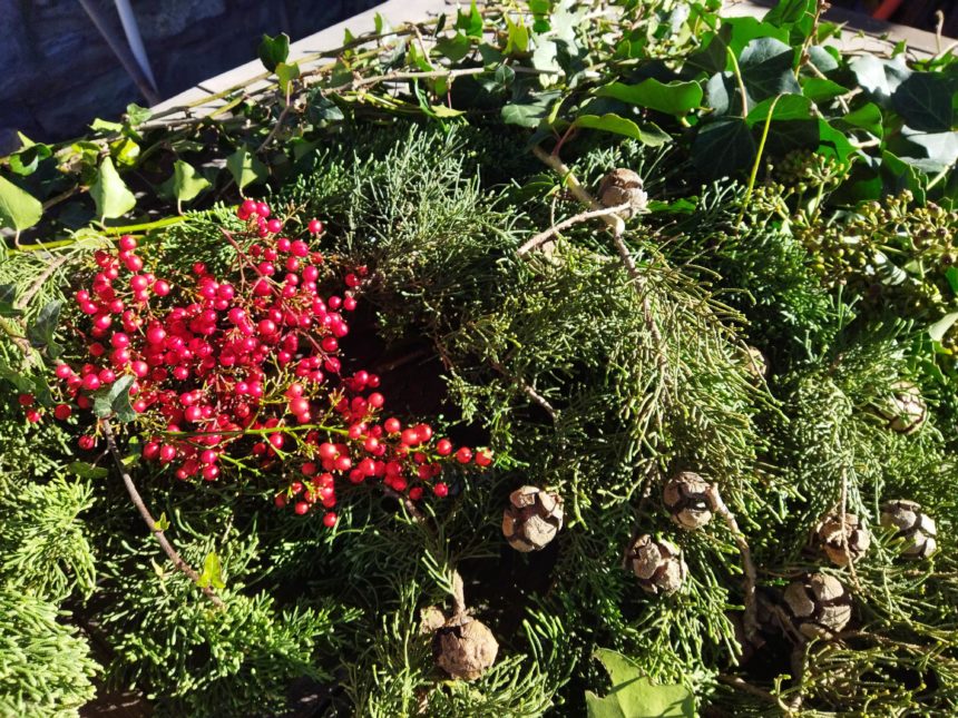 秋から週2~3でフィレンツェで定期的に仕事をしているのですが、家にいる日に限って天気が悪く・・・そしてあっという間に12月! ちょうど1週間前やっとこ晴れたので、ずっとやりたかったクリスマスリースを作ることにしました。作るだけなら天気が悪くてもできますが、なんせ材料調達から始めるもので(笑)。早いもので今年で5年目、いや、5回目。記録として書いているブログを見たら、なぜか昨年は作っていませんでした(全く記憶なし💦)。