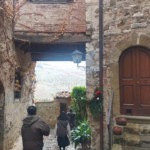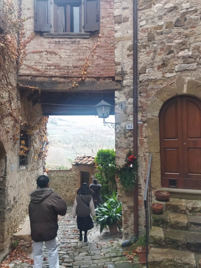 その後は荷物を置かせてもらい、モンテフィオラッレの村を散策。雨が降ったりやんだりでしたが、濡れた石畳、雲の隙間からもれる陽などが美しく。今回は行きませんでしたが、ワイナリーの入口も開いていたので、従業員の方に声をかけて村の全景が見える絶景スポットから写真を撮らせてもらうことに。