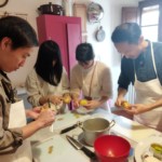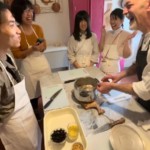 お客様はご夫婦に娘さん、友人の息子さんである青年の4人。まずは皆でおそろいのエプロンをつけていざ、キッチンへ! 写真で分かるように、最初からテンション高く、おしゃべりと笑いが絶えませんでした。私も仕事中(めっちゃ楽しんでるけど)の貴重な写真を頂いたので、せっかくなのでたくさん載せちゃいます。