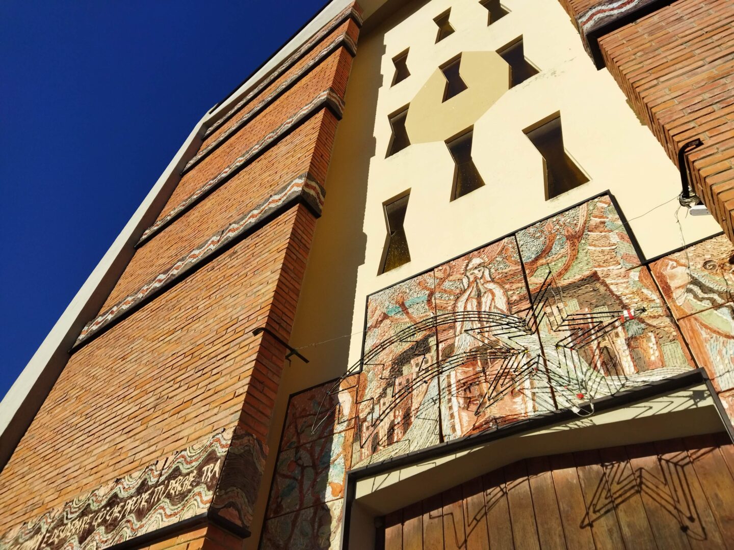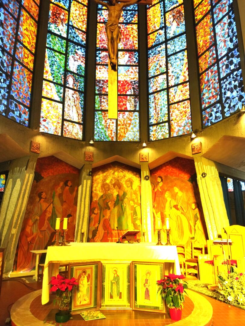 当初にアンドレイ―ナが制作したのは、「ペンテコステ(聖霊降臨:イエスの復活・昇天後、集まって祈っていた120人の信徒たちの上に神からの聖霊が降ったという新約聖書にあるエピソードの1つ)」やその上にある「世界創造」のガラス絵、ファサードの「聖ヨハネの黙示録」、そして2010年には再利用素材を使った240㎡のモザイク「エゼキエルの幻視」を完成させます。その後そのモザイクは、世界遺産のモザイクの町・ラヴェンナ のモザイク・ミュージアムの国際資料センターに登録され、アンドレイ―ナが中心となって結成されたアソシエーションを通じてこの教会を「世界一のモザイクの教会」にするプロジェクトとそのプロモーションを行っています。