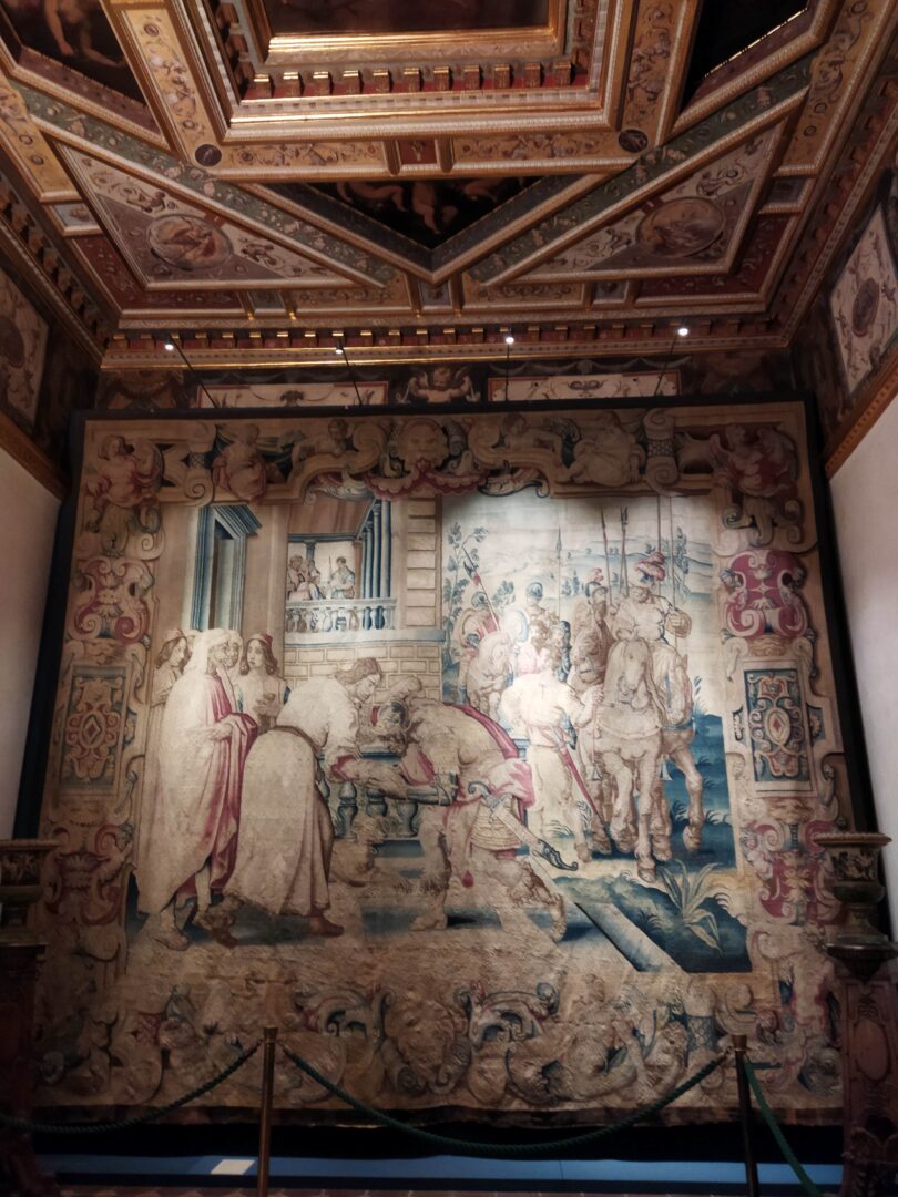 ヴェッキオ宮殿では他にもメディチ家の居住室、エレオノーラ・ディ・トレドの間やフランチェスコ1世の書斎などの装飾も手掛けていますが、展示会は500人の間を含め、博物館のルート内の6室に別れて展示。織物のための下絵、特に動物の描写に優れていたそうで、展示会でも2つの大きな織物の展示がありました。このように名を知られる芸術作品の最終形と元となる素描を合わせて展示することで、作品の裏にどれだけの準備があり、どれだけの人が関わっているのかを知ることができると同時に、その壮大な事業を推し進めたコジモ1世の当時の凄さを思い知ることができます。