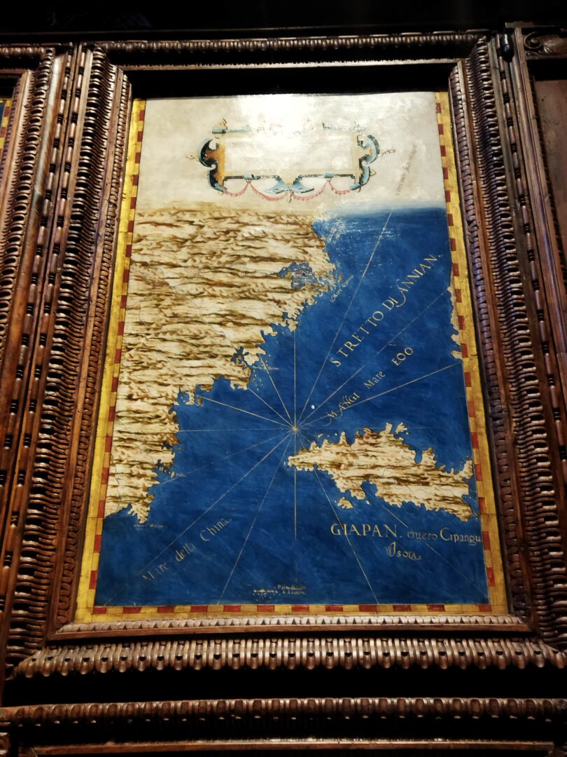 展示会の最後は百合の間。ここではストラダーノが人生後半に情熱をかけた、科学や地図向けの銅板印刷を集めています。そこにはアメリア新大陸を発見したコロンブスやアメリゴ・ヴェスプッチの銅板画があり、その隣に地図の間があるのは偶然ではないはず・・・