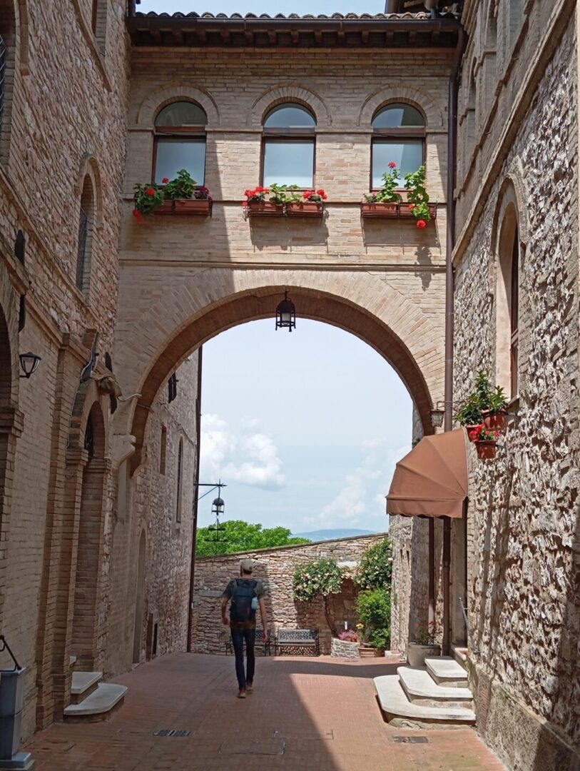 ローマ時代に起源をもつ要塞ですが、現在は見られるのは14世紀に建設されたもの。内部は薄暗い廊下でつながっており、観光客も少ない中で、一人そこを歩きながら「迷ったらどうなるのかな」とちょっと心配になったほど。もちろん表示もあるので迷うことはなく、西の端にある塔に上ればアッシジの町、周辺の大自然を360度見渡すことができます。